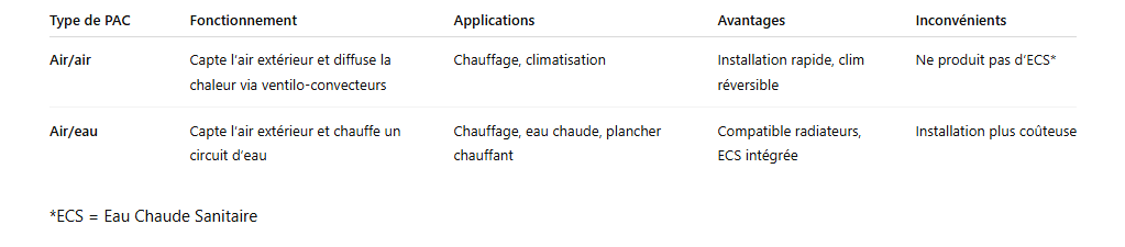 Tableau comparatif PAC air/air vs PAC air/eau